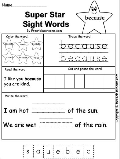 Because Sight Word Worksheet. With splashlearn's worksheets on sight words, kids will be able to sound out. They learn to recognize them automatically by sight!